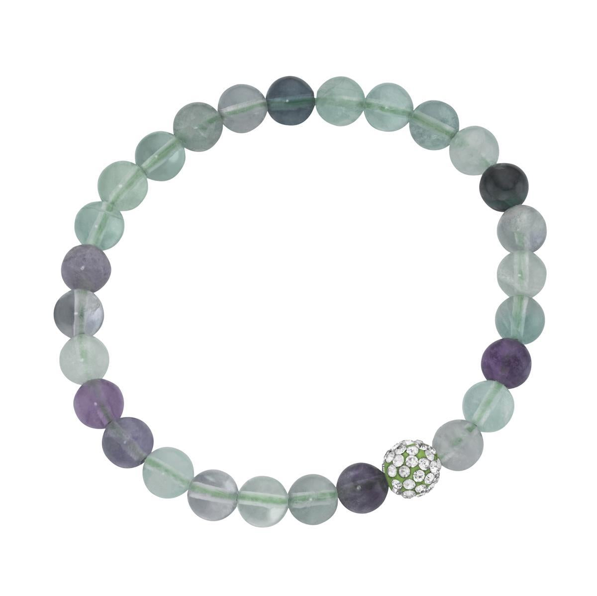Steinarmband „Klarheit“ auf Gummifaden, Fluorit Kugeln ø ca. 6 mm + Kugel ø ca. 8 mm mit hellgrünen Kristallsteinen rund